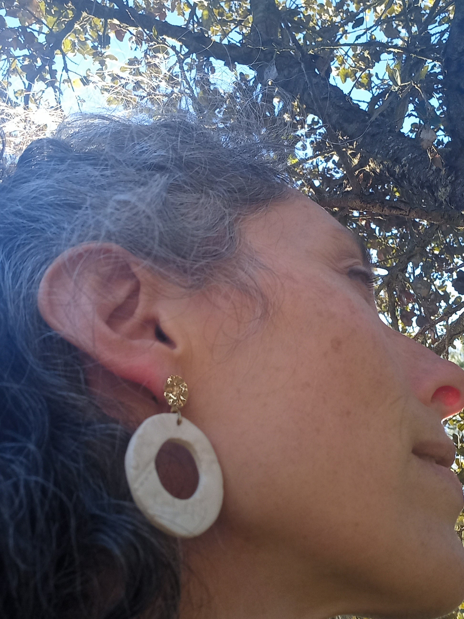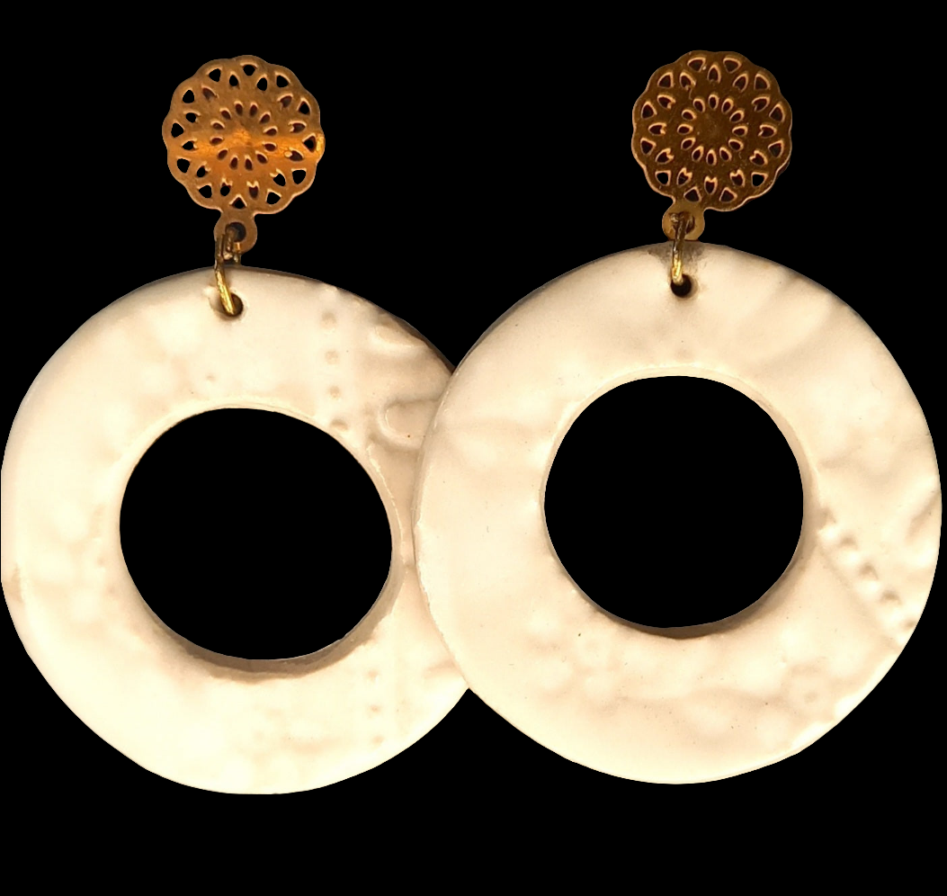 cette paire de boucles d'oreilles en grès blanc émaillé, avec une attache dorée en acier inoxydable, est sublimée par une délicate impression de textile brodé à la main. 🌼🌿