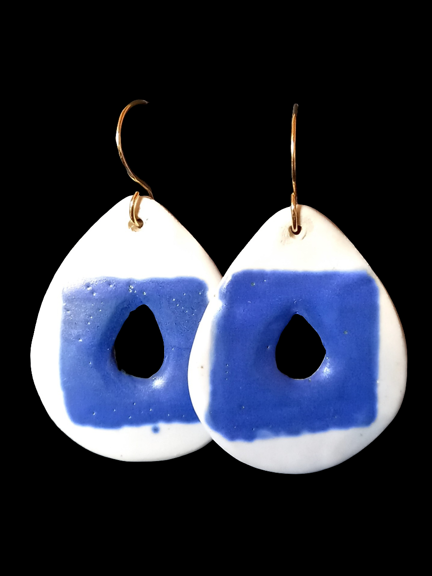 Boucles d'oreilles en céramique, mêlant des teintes lumineuses de blanc et de bleu, au design à la fois simple et original, parfaites pour une touche d'élégance unique.