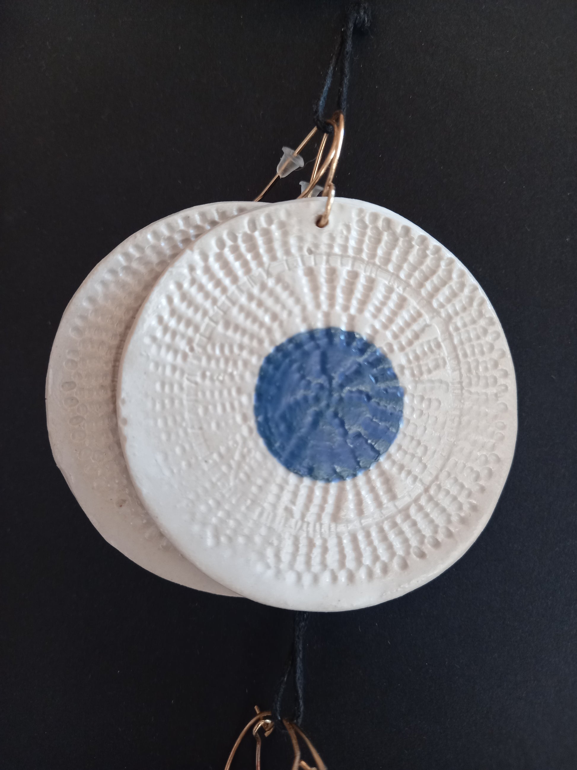 Grandes boucles d'oreilles rondes en grès blanc émaillé blanc, conçues pour apporter du caractère à votre style. Elles sont ornées de touches d'engobe bleu, créant un subtil jeu de lumière.