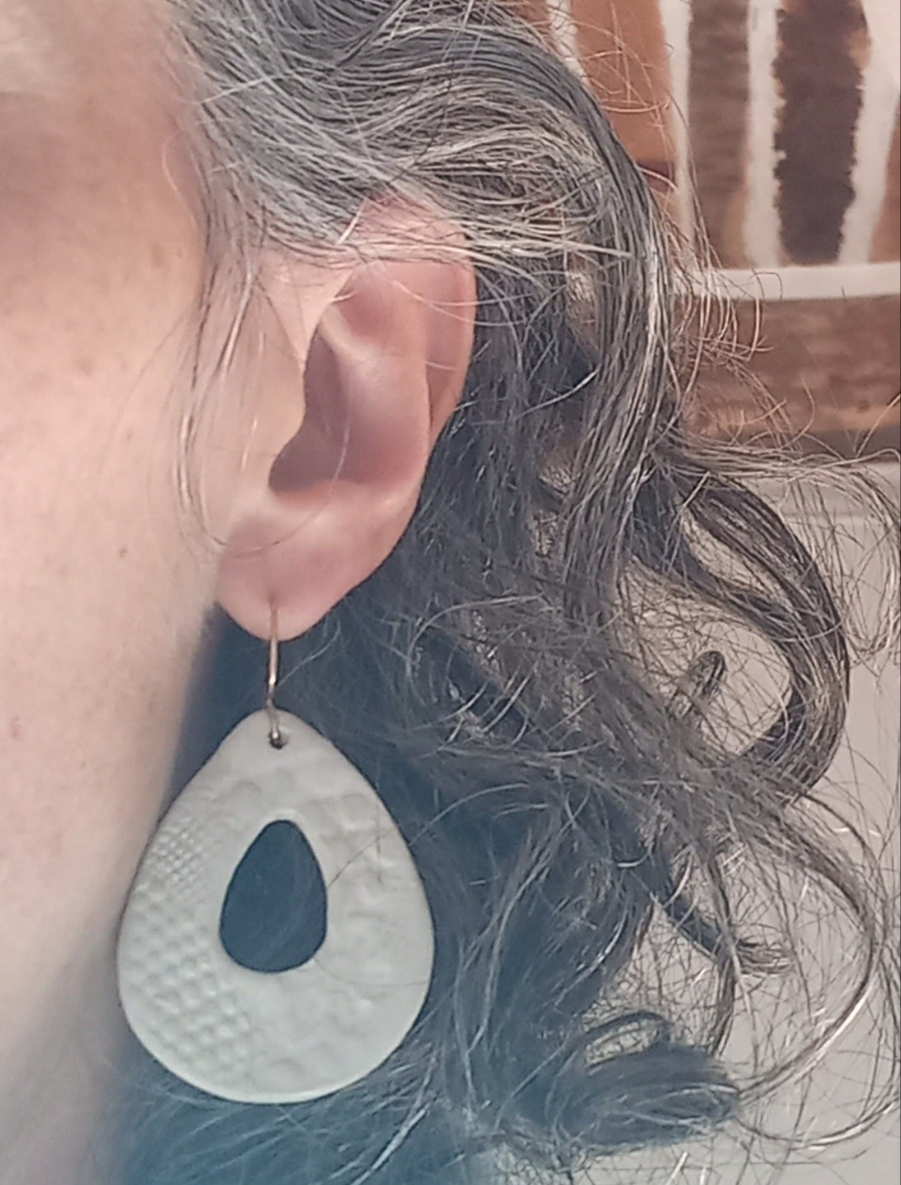 Boucles d'oreilles en grès blanc émaillé, ornées d'une délicate empreinte de tissu brodé à la main.